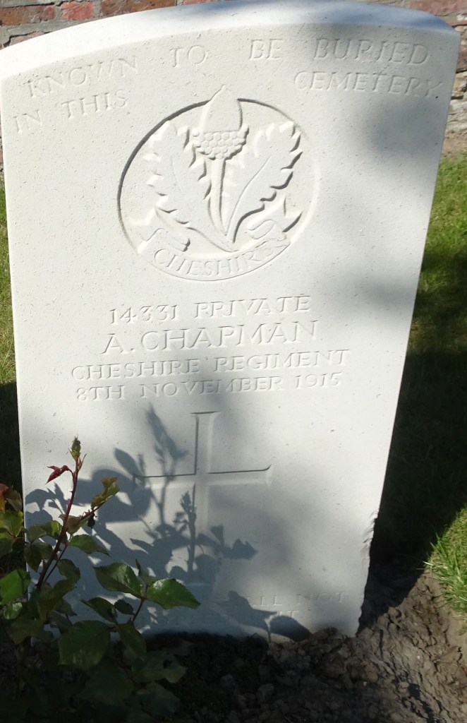 8/11/1915 Private Alfred Chapman 11th Bn. Lancashire Cottage Cemetery, Hainaut Belgium. ‘14431’ Son of Mrs Sarah Ann Chapman, of 5, Hyde Grove, Sale, Manchester.