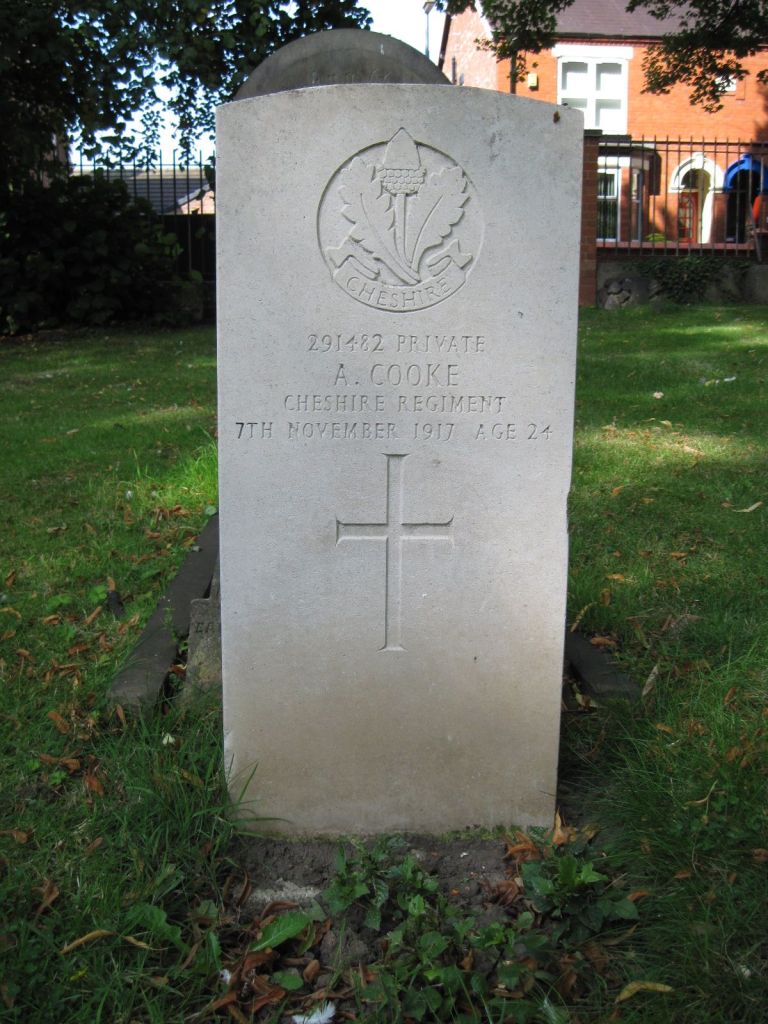 7/11/1917 Private Arthur Cooke (Age 24) 7th Bn. Crewe (Coppenhall) Cemetery, Cheshire United Kingdom. ‘291482’ Son of George and Mary Cooke. Born at Crewe. Served in Egypt. (pic from findagrave.com – with thanks)