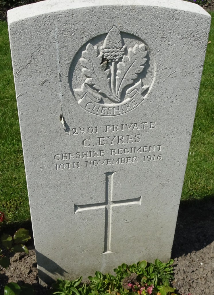 27/06/1916 Serjeant Albert Edward Pye (Age 23) 5th Bn. Hebuterne Military Cemetery, Pas de Calais France. ‘1434’ Son of Mrs. Kate Florance Pye, of 51, Paradise St., Northwich, Cheshire.
