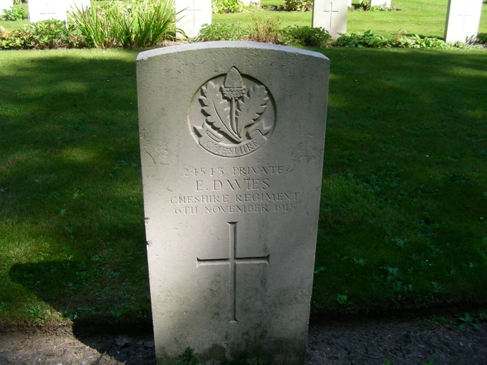 6/11/1915 Private Edward Davies (Age 23) 11th Bn. Rifle House Cemetery, Hainaut Belgium. ‘24543’ Son of Alfred and Alice Ann Davies, of 26, Sandridge Rd., New Brighton, Wallasey. (pic from findagrave.com – with thanks)