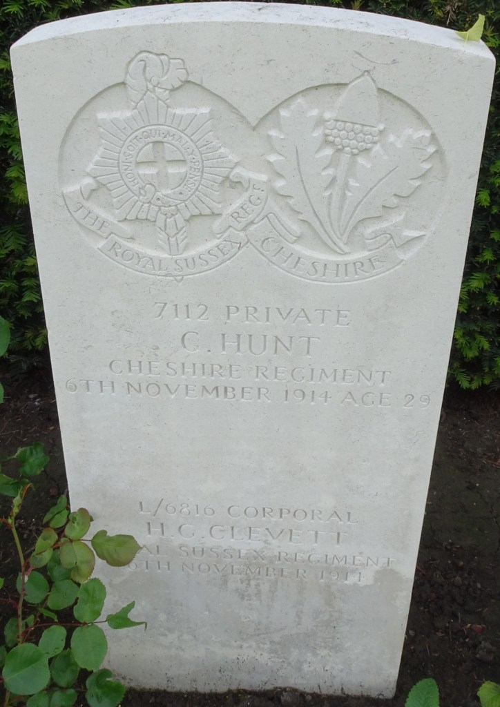 6/11/1914 Private George Hunt (Age 30) 1st Bn. Ypres Town Cemetery Extension, West-Vlaanderen Belgium. ‘7112’ Son of Mr. and Mrs. Tomiss Hunt, of 22, Manor Rd., Lillington; husband of Edith Summers (formerly Hunt), of 10, Manor Rd., Lillington, Leamington.