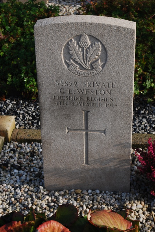 4/11/1918 Private John Edward (?GE?) Weston 23rd Bn. St. Leger Churchyard, Hainaut Belgium. ‘65822’ (pic from findagrave.com – with thanks)