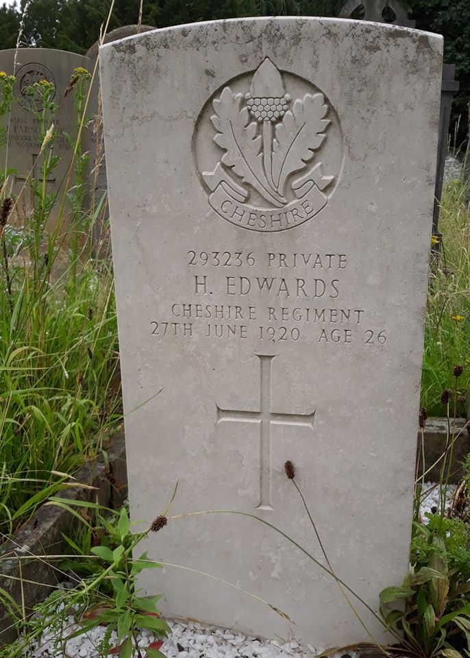 27/06/1920 Private Harry Edwards (Age 26) 1st/7th Bn. Christleton (St. James) Churchyard, Cheshire United Kingdom. ‘293236’ Son of Mrs. M. Edwards, of Mount Pleasant, Christleton.