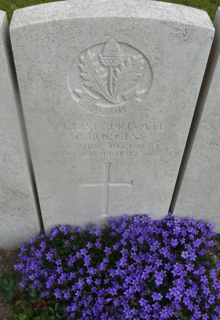 5/11/1917 Private John Burgess (Age 22) 1st Bn. Lijssenthoek Military Cemetery, West-Vlaanderen Belgium. ‘243251’ Son of Thomas and Alice Ann Burgess, of 128, Mottram Rd., Stalybridge, Cheshire.