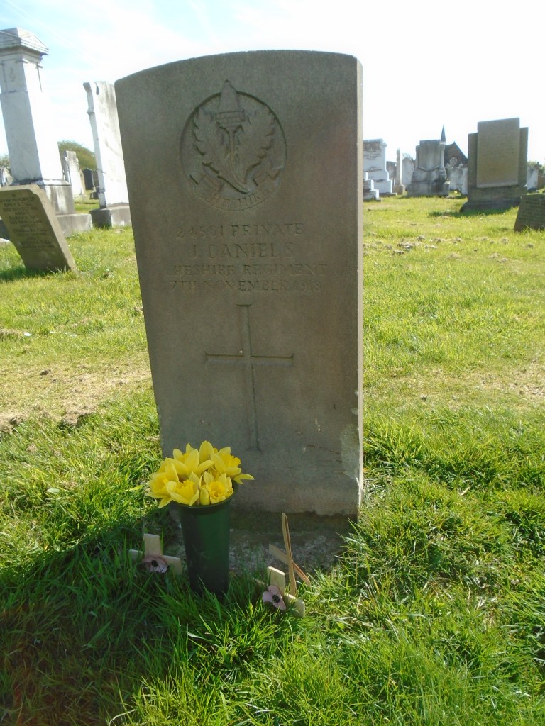7/11/1918 Private Joseph Daniels 6th Bn. Wallasey (Rake Lane) Cemetery, Cheshire United Kingdom. ‘24501’ Husband of Jane Daniels, of 39, Guildford St., Egremont, Wallasey. (pic from findagrave.com – with thanks)