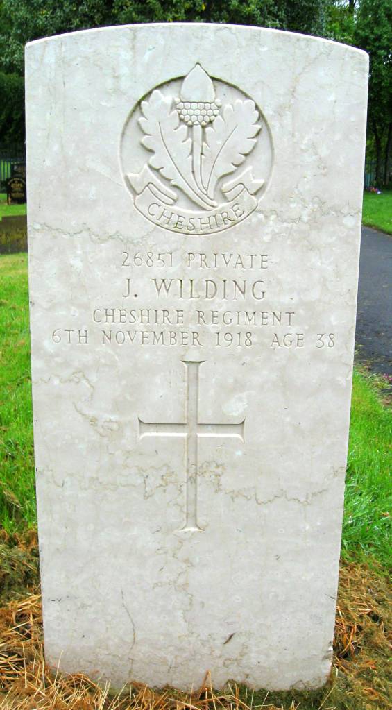6/11/1918 Private John Wilding (Age 38) 14th Bn. Northwich Cemetery, Cheshire United Kingdom. ‘26851’ Son of William Wilding; husband of Lilian Wilding, of 51, Queen St., Garden Lane, Salford. (pic from findagrave.com – with thanks)