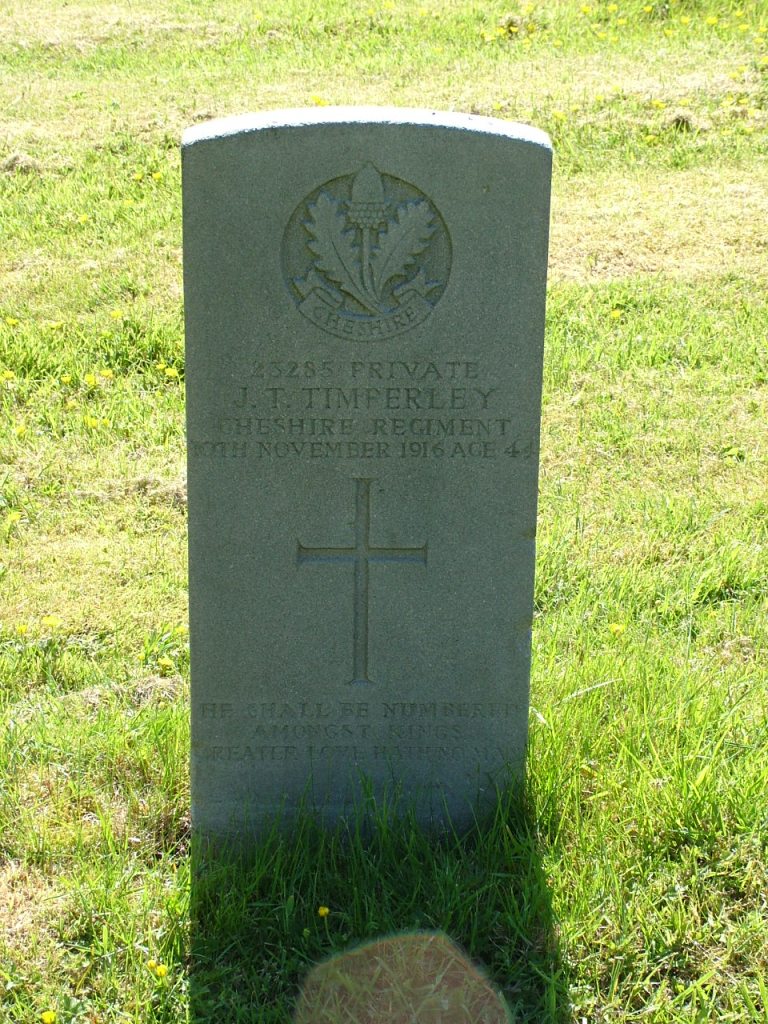 10/11/1916 Private John Thomas Timperley (Age 44) “Y” Coy. 15th Bn. Accrington Cemetery, Lancashire United Kingdom. ‘23285’ Son of John Thomas and Elizabeth Timperley. Born at Glasgow. (pic from findagrave.com – with thanks)