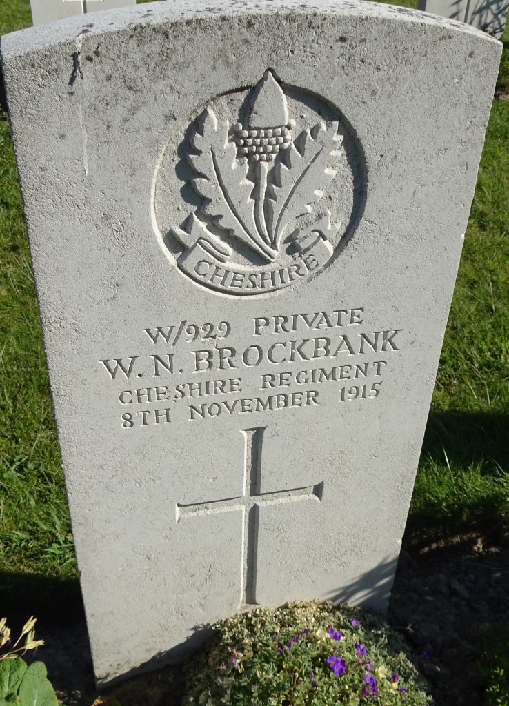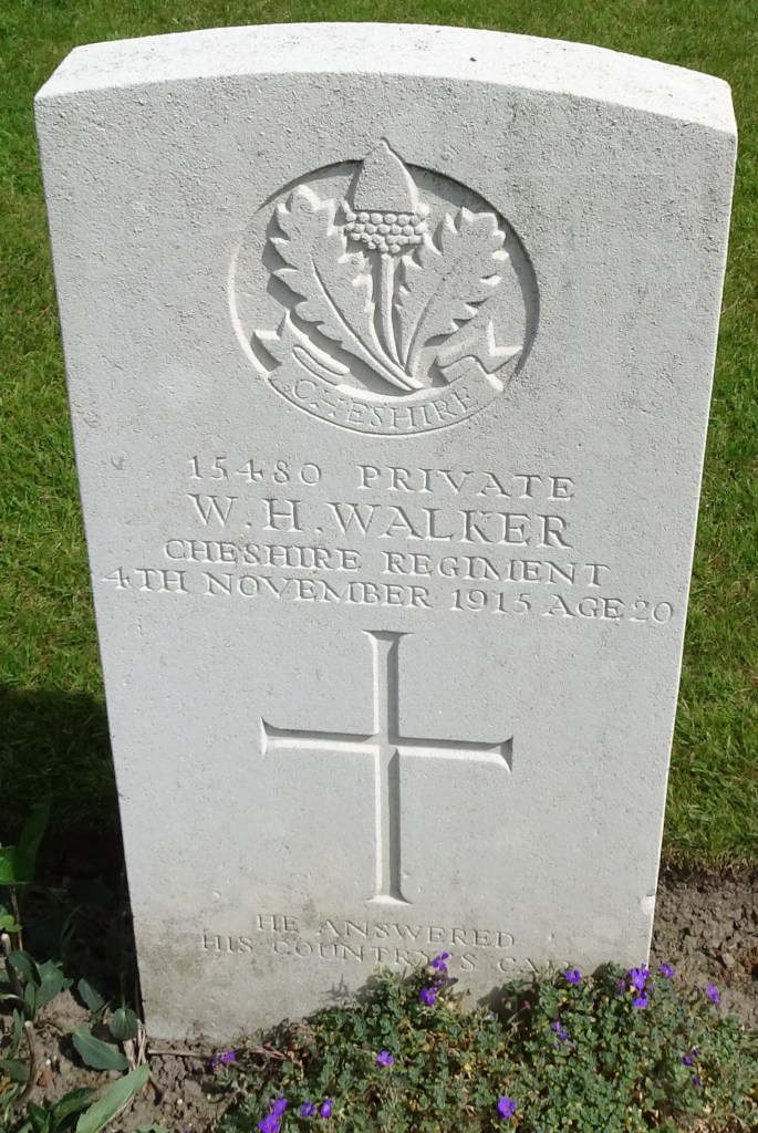 4/11/1915 Private William Henry Walker (Age 20) “D” Coy. 10th Bn. Hyde Park Corner (Royal Berks) Cemetery, Hainaut Belgium. ‘15480’ Son of George E. and P. Walker, of 81, Runcorn Rd., Barnton, Northwich. Enlisted Aug., 1914.