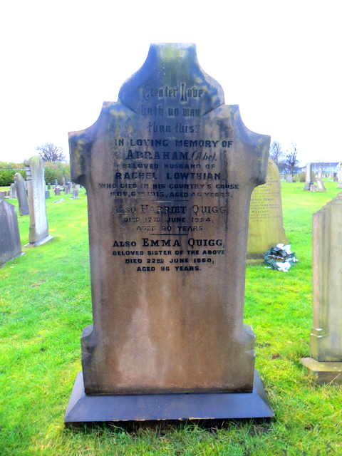 6/11/1915 Serjeant Abraham Lowthian (Age 46) “C” Coy. 8th Bn. Bootle Cemetery, Lancashire United Kingdom. ‘15501’ Husband of Rachel Lowthian, of 21, Tattersall Rd., Litherland, Liverpool. (pic from findagrave.com – with thanks)