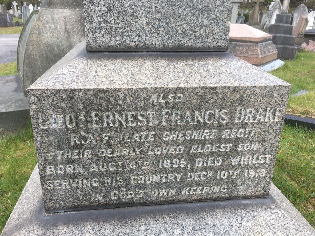 10/12/1918 Lieutenant Ernest Francis Drake (Age 23) 3rd Bn. Transferred to Royal Air Force Sale Cemetery, Cheshire, United Kingdom. X. 5344 Son of Sidney and Lois Drake, of “Shandon” Harboro’ Rd., Ashton-on-Mersey, Cheshire. Born at Sale (pic from findagrave.com – with thanks)
