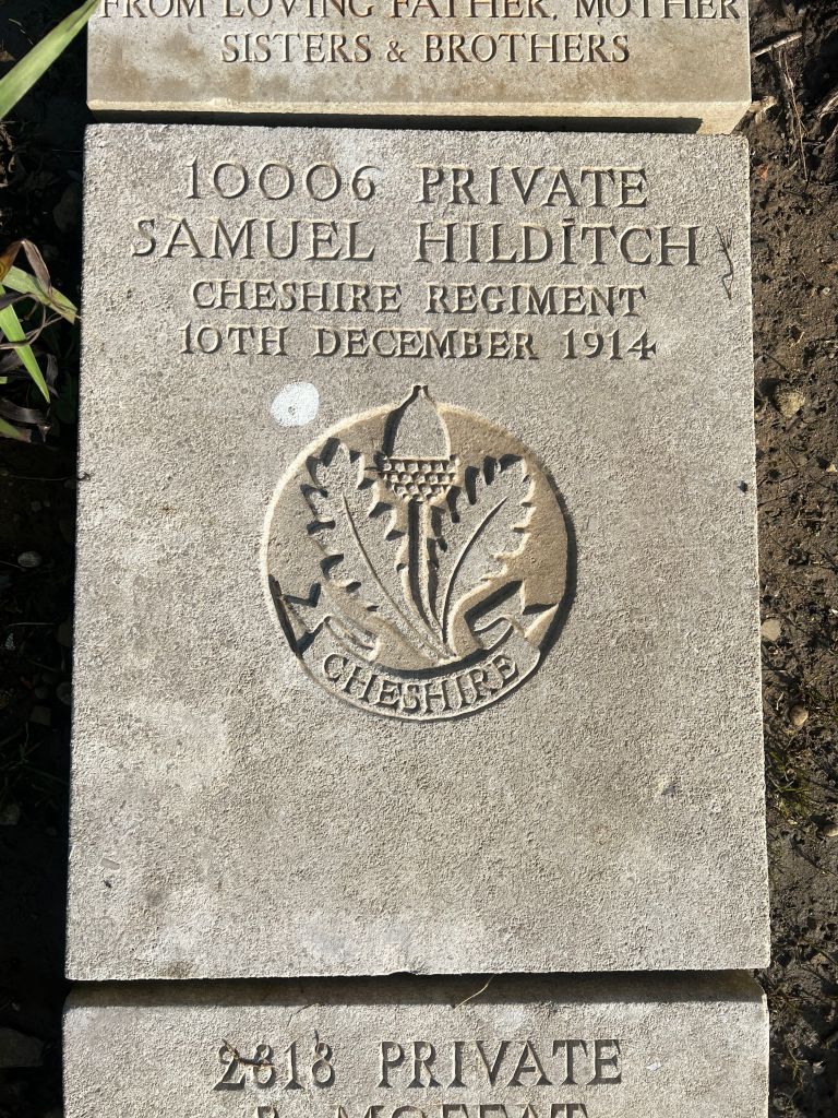 10/12/1914 Private Samuel Hilditch (Age 25) 1st Bn. Boulogne Eastern Cemetery, Pas de Calais France. ‘10006’ Son of Edwin and Annie Hilditch, of Crewe, Cheshire. (pic from findagrave.com – with thanks)