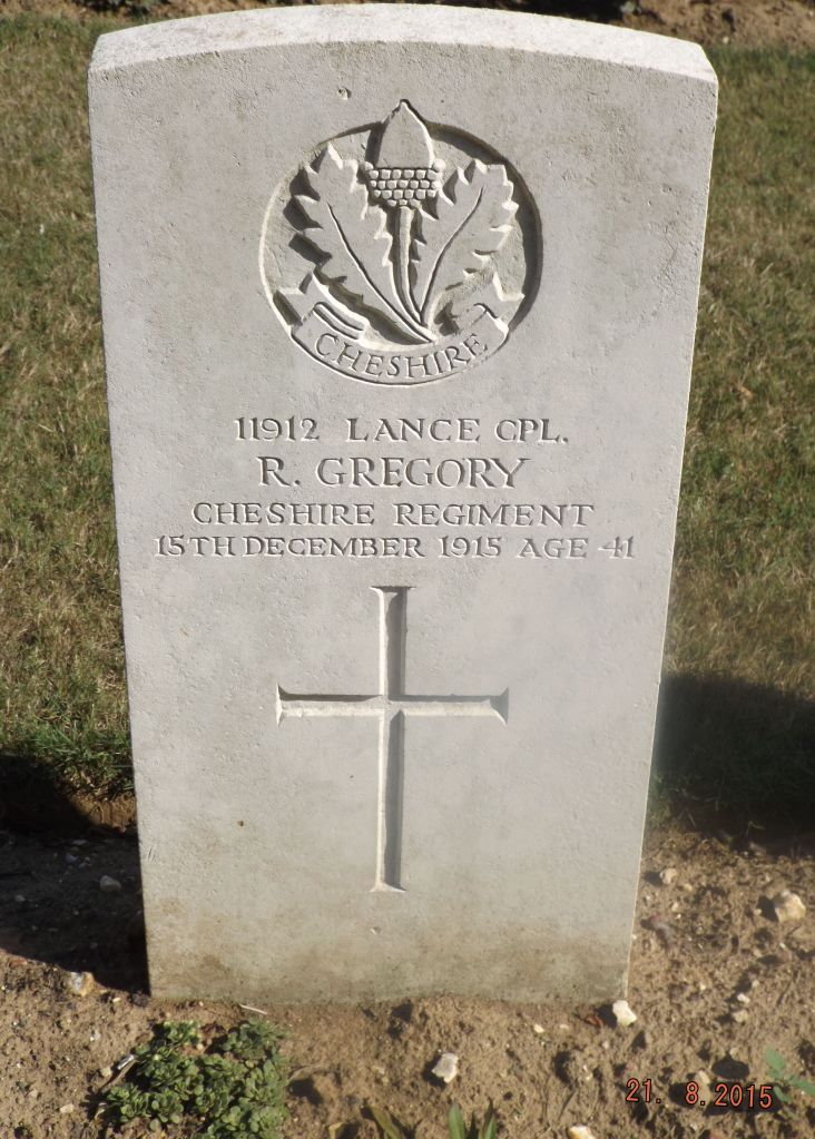 15/12/1915 Lance Corporal Robert Gregory (Age 41) 1st Bn. Citadel New Military Cemetery, Fricourt, Somme France. ‘11912’ Husband of Rosetta Gregory, of 97, Oakfield St., Altrincham, Cheshire. (pic from findagrave.com – with thanks)