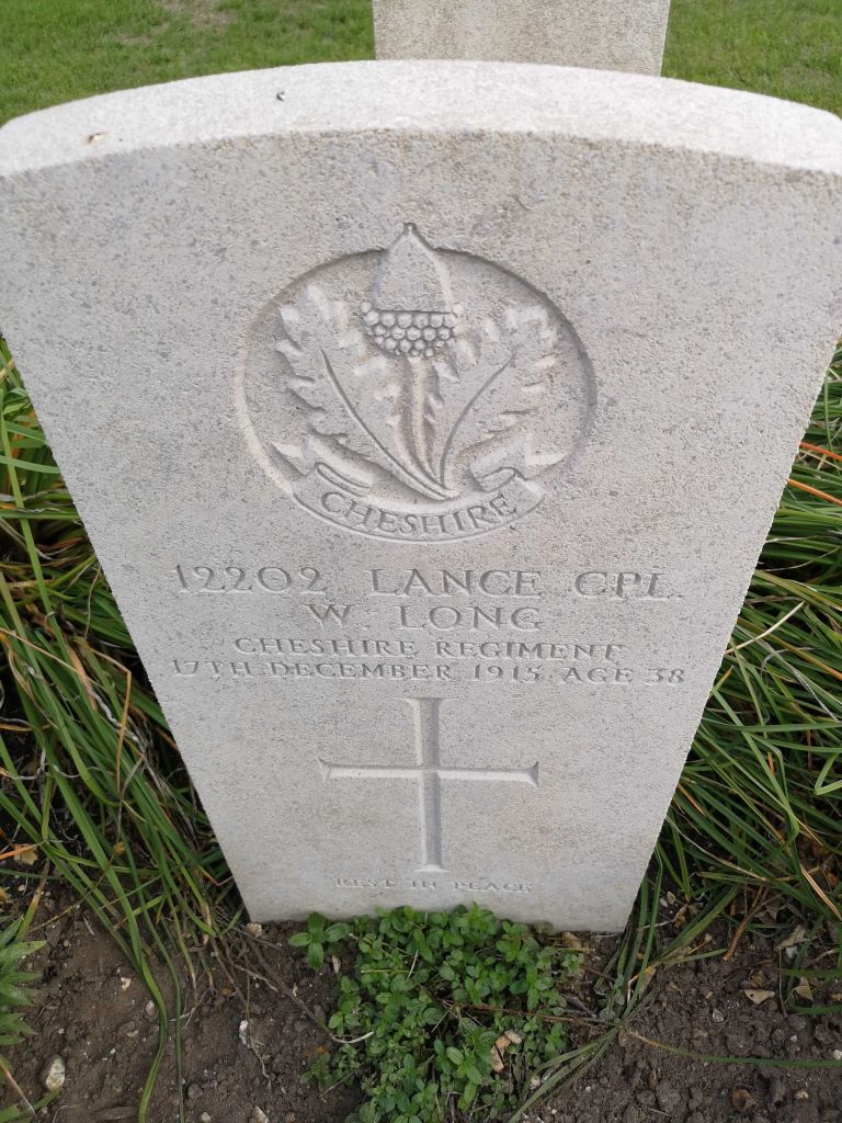17/12/1915 Lance Corporal Walter Long (Age 38) 1st Bn. St. Sever Cemetery, Rouen, Seine-Maritime France. ‘12202’ Son of Patrick and Esther Long, of Hyde; husband of S. H. Long, of 43, Hallbottom St., Newton, Hyde. (pic from findagrave.com – with thanks)