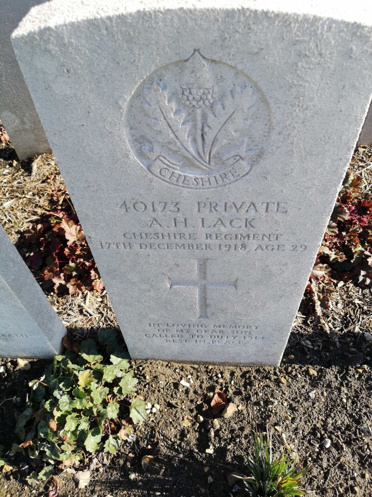 17/12/1918 Private Alfred Herbert Lack (Age 29) 1st Bn. St. Sever Cemetery Extension, Rouen, Seine-Maritime France. ‘40173’ Son of Alfred and Martha Lack, of 7, Albert St., Northampton. (pic from findagrave.com – with thanks)