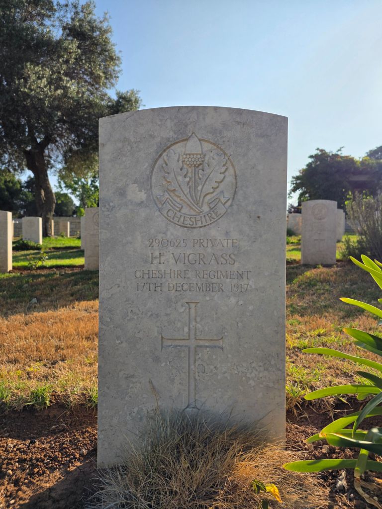 17/12/1917 Private Harry Vigrass 7th Bn. Jerusalem War Cemetery, Israel and Palestine (including Gaza). ‘290625’ (pic from findagrave.com – with thanks)
