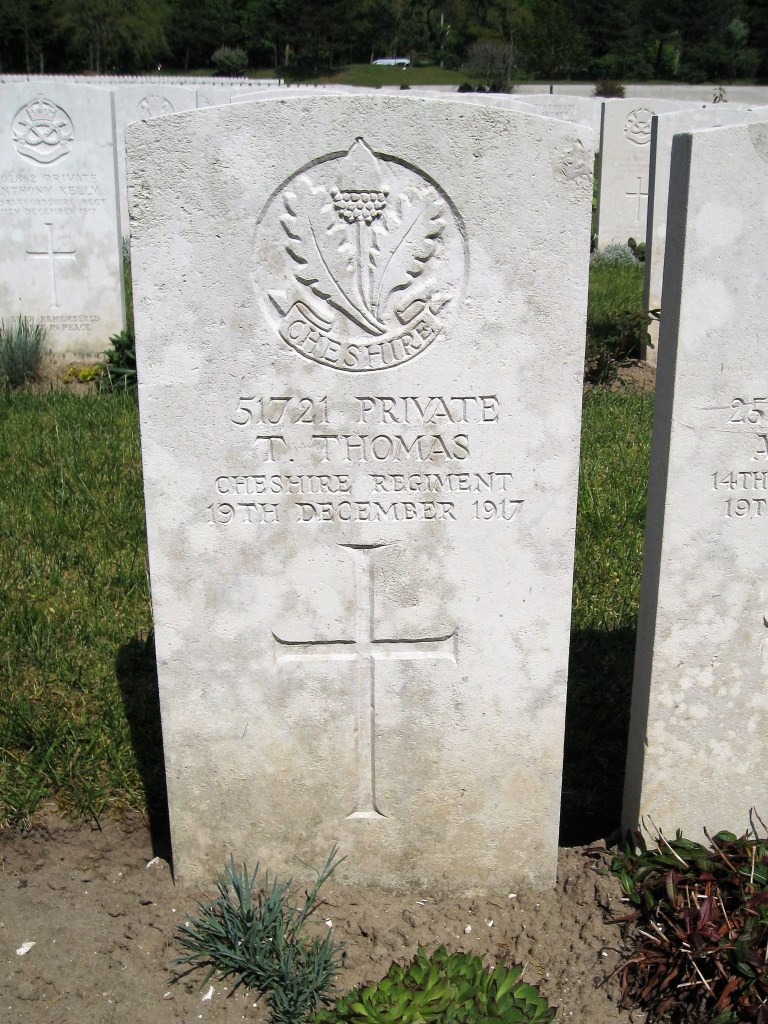 19/12/1917 Private Thomas Thomas 16th Bn. Etaples Military Cemetery, Pas de Calais France. ‘51721’ (pic from findagrave.com – with thanks)