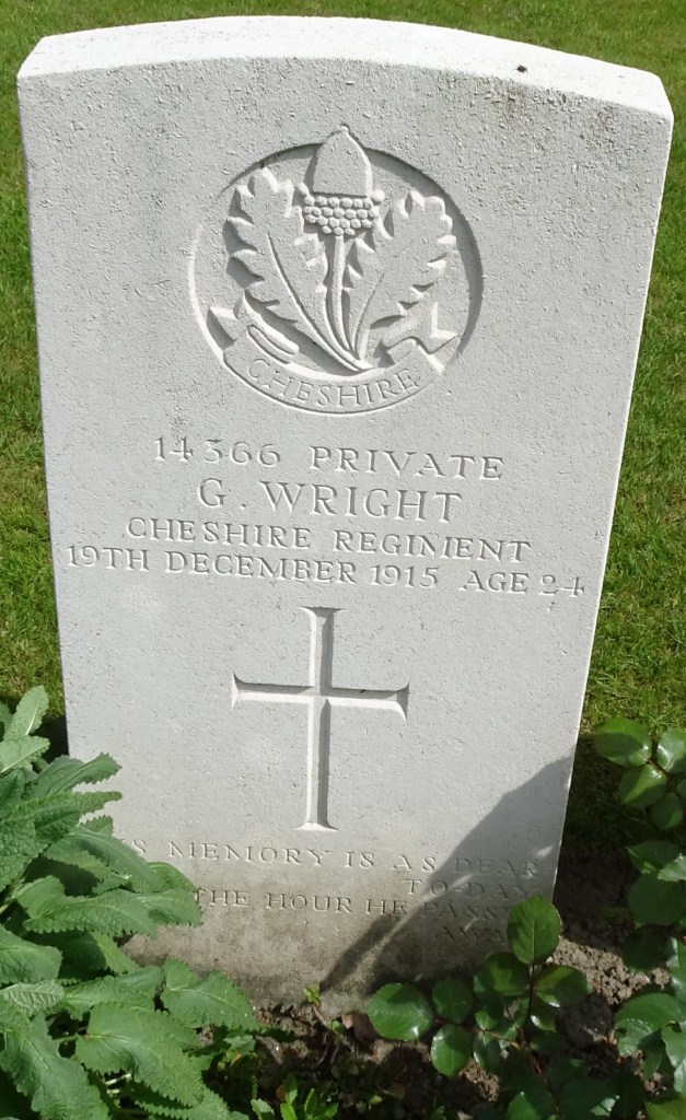 19/12/1915 Private George Wright (Age 24) 10th Bn. Hyde Park Corner (Royal Berks) Cemetery, Hainaut Belgium. ‘14366’ Husband of Mabel Wright, of 35, Thomas St., Congleton.