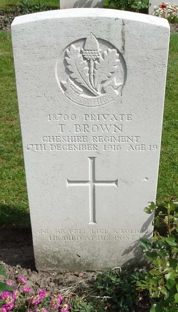 17/12/1916 Private Thomas Brown (Age 19) 11th Bn. Hyde Park Corner (Royal Berks) Cemetery, Hainaut Belgium. ‘18700’ Son of Mrs. Josephine Brown, of 31, Market Terrace, Crewe.