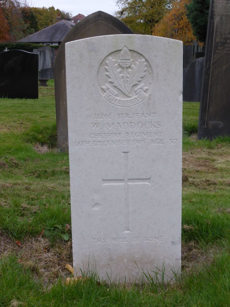 18/12/1915 Serjeant William Maddocks (Age 37) 8th Bn. Hale Cemetery, Cheshire United Kingdom. ‘11261’ Husband of Florence Maddocks, of 14, Oakfield St., Altrincham. (pic from findagrave.com – with thanks)