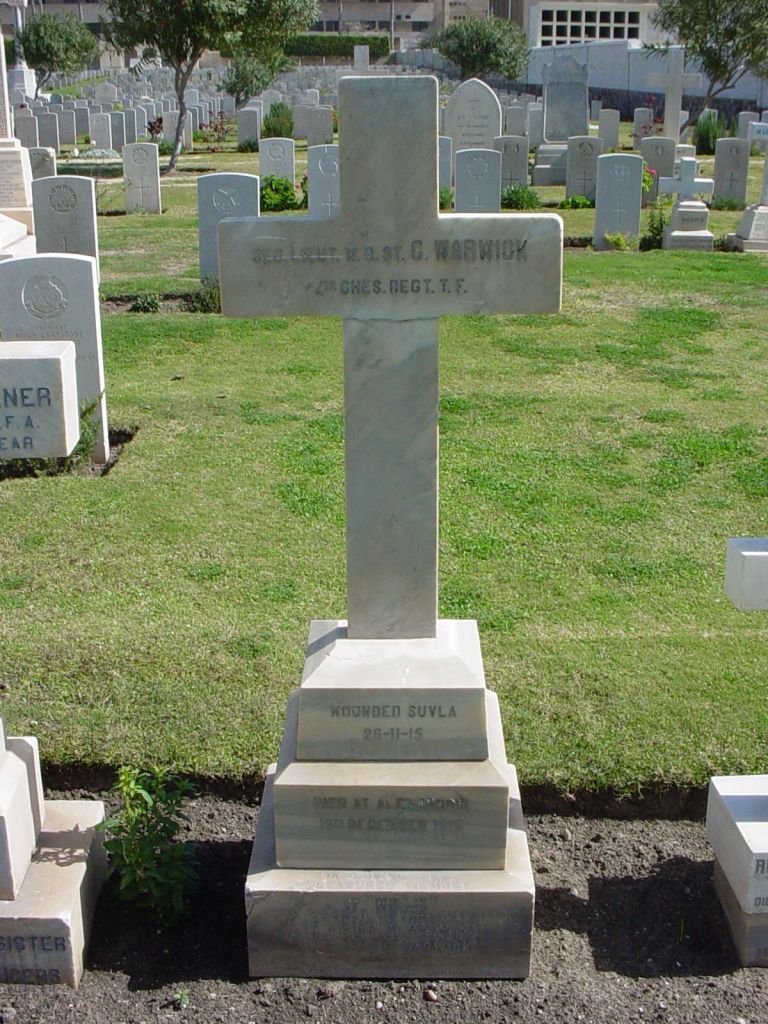 19/12/1915 Second Lieutenant William Robert St. Clair Warrick 1st/4th Bn. Alexandria (Chatby) Military and War Memorial Cemetery, Egypt. (pic from findagrave.com – with thanks)