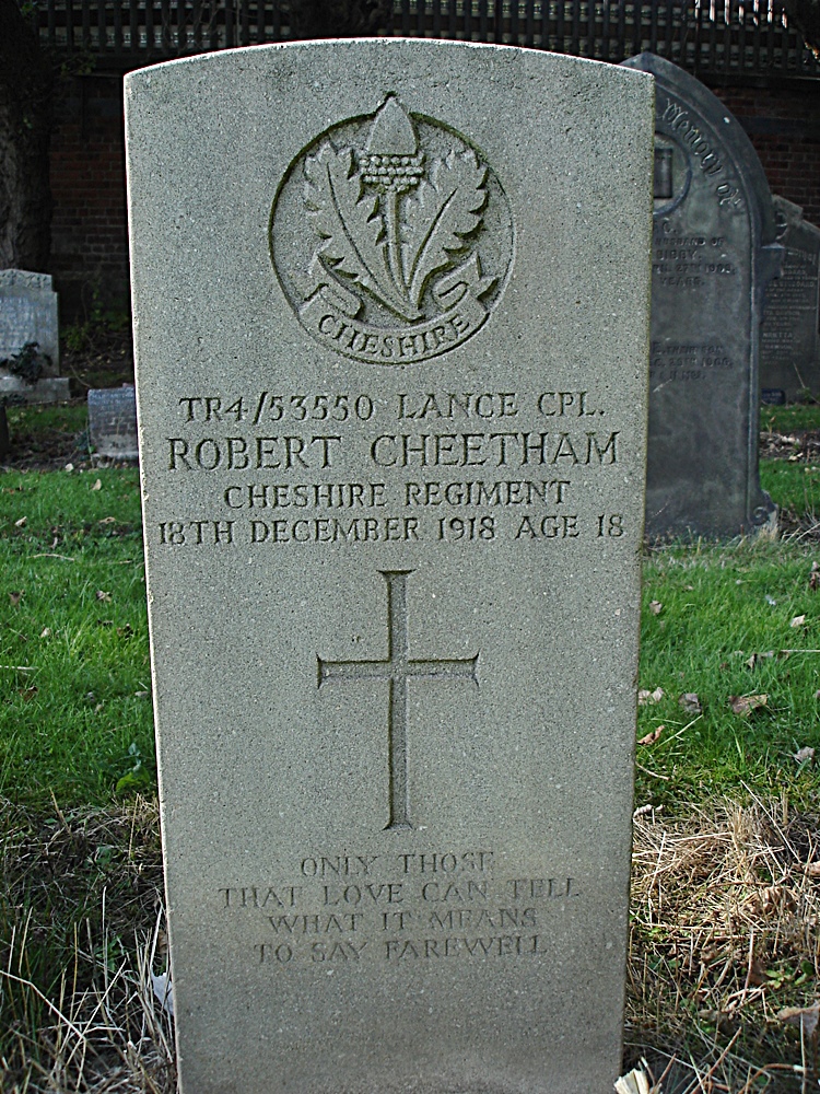18/12/1918 Lance Corporal Robert Cheetham (Age 18) 52nd Bn. Salford (Weaste) Cemetery, Lancashire United Kingdom. ‘TR4/53550’ Son of Mrs. Rose Cheetham, of 8, Granville St., Salford. (pic from findagrave.com – with thanks)