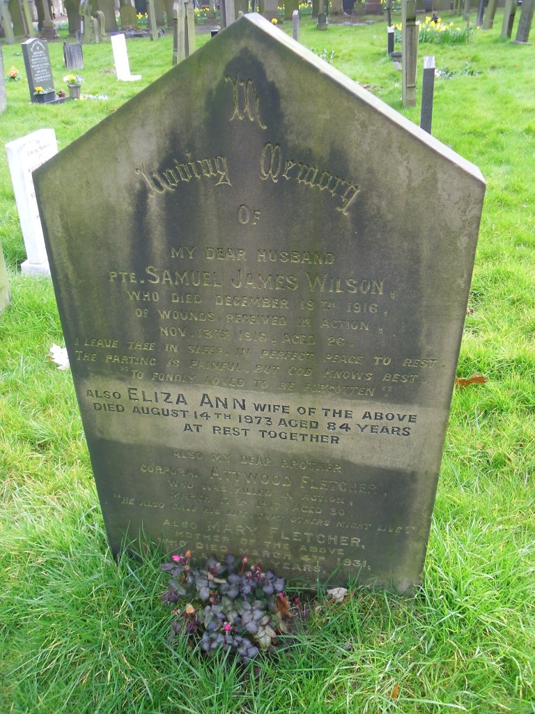 19/12/1916 Private Samuel James Wilson 1st/6th Bn. Stockport Borough Cemetery, Cheshire United Kingdom. ‘2581’ (pic from findagrave.com – with thanks)