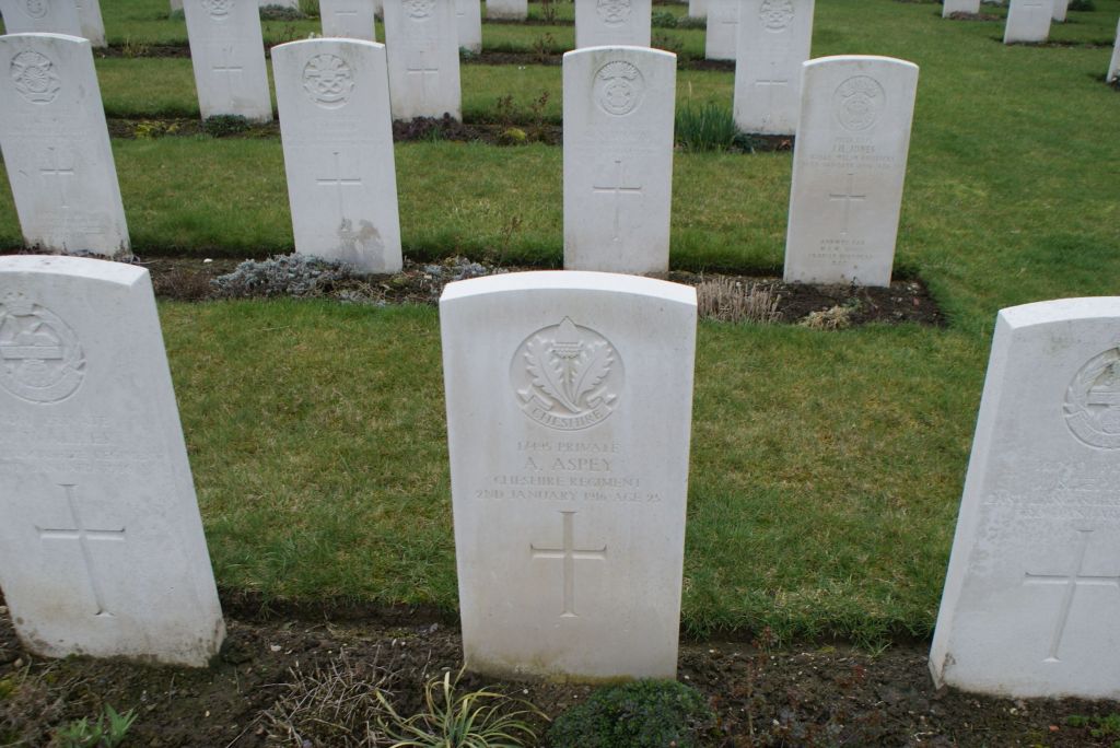 2/01/1916 Private Arthur Aspey (Age 25) 9th Bn. St. Vaast Post Military Cemetery, Richebourg-L’avoue, France. Nephew of Mr. H. Aspey, of Bow Lane, Bowdon, Cheshire.