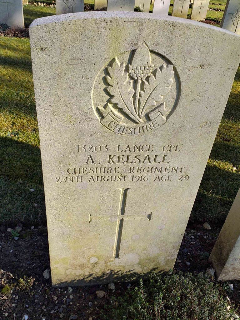27/08/1916 Lance Corporal Alfred Kelsall (Age 29) 11th Bn. Blighty Valley Cemetery, Authuille Wood, Somme France. ‘13203’ Husband of Nellie Kelsall, of 28, Ann St., Reddish, Stockport. (pic from findagrave.com. – with thanks)