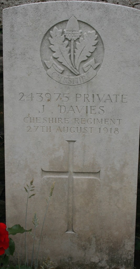 27/08/1918 Private John Davies 1st/5th Bn. St. Hilaire Cemetery Extension, Frevent, Pas de Calais France. ‘243975’ (pic from findagrave.com. – with thanks)