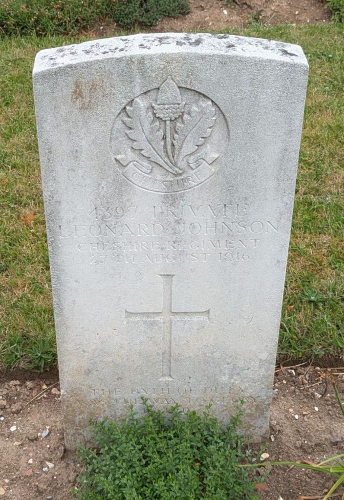 27/08/1916 Private Leonard Johnson (Age 36) 6th Bn. Abbeville Communal Cemetery, Somme France. ‘4397’ Son of Joseph and Jane Johnson, of Hazel Grove, Stockport. (pic from findagrave.com. – with thanks)