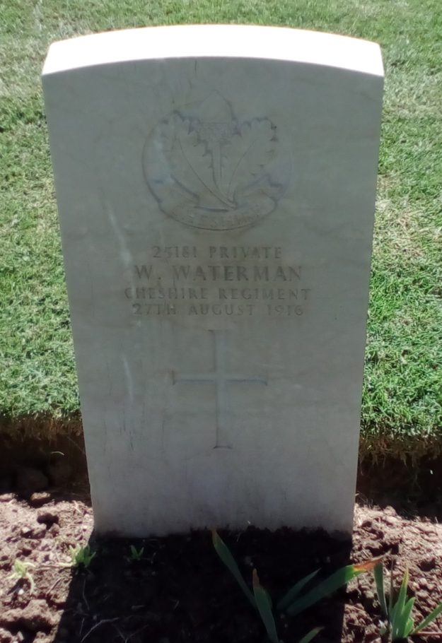 27/08/1916 Private William Waterman 2nd Bn. Salonika (Lembet Road) Military Cemetery, Greece. ‘25181’ (pic from findagrave.com. – with thanks)
