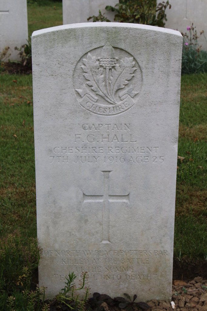 7/07/1916 Captain Frederic Grainger Hall (Age 25) 13th Bn. Serre Road Cemetery No.2, Somme France. Son of The Rev. Frederic J. and Elizabeth Sophia Hall of St. Just, Northaw, Middx. (pic from findagrave.com – with thanks)
