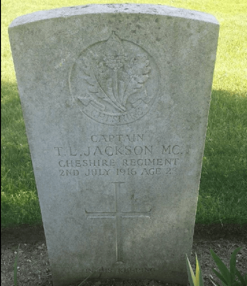 2/07/1916 Captain Thomas Leslie Jackson (Age 23) MC 9th Bn. Gordon Dump Cemetery, Ovillers-La Boisselle, Somme France. Son of Dr. Thomas Jackson and Mrs. Jackson, of Greystoke, Cumberland. (pic from findagrave.com – with thanks)