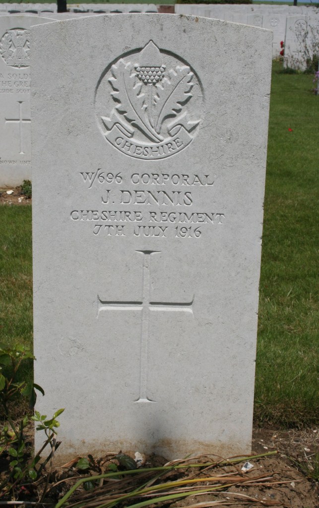 7/07/1916 Corporal John Dennis 13th Bn. Ovillers Military Cemetery, Somme France. ‘W/696’ (pic from findagrave.com – with thanks)