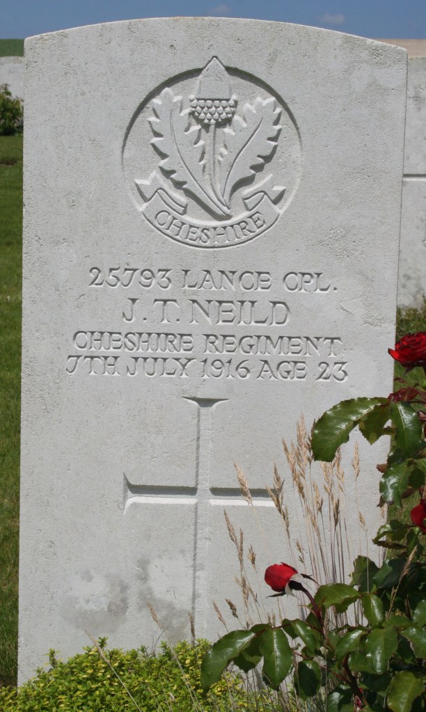 7/07/1916 Lance Corporal James Tidswell Neild (Age 23) No.4 Coy 13th Bn. Ovillers Military Cemetery, Somme France. ‘25793’ Son of the late Mr. and Mrs. James Tidswell Neild, of Manchester; husband of Muriel Paton (formerly Neild), of 19, Norman Rd., Moston, Manchester. (pic from findagrave.com – with thanks)