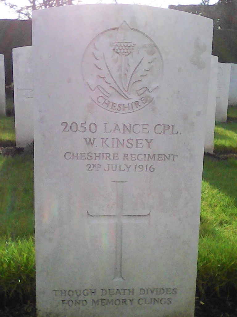 2/07/1916 Lance Corporal William Kinsey (Age 30) 5th Bn. Doullens Communal Cemetery Extension No.1, Somme France. ‘2050’ Son of Mrs. J. Kinsey, of Ship St., Frodsham; husband of W. Kinsey, of 12, Moreton Terrace, Frodsham, Warrington. (pic from findagrave.com – with thanks)