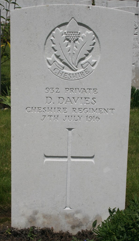 7/07/1916 Private David Davies 13th Bn. Ovillers Military Cemetery, Somme France. ‘932’ (pic from findagrave.com – with thanks)