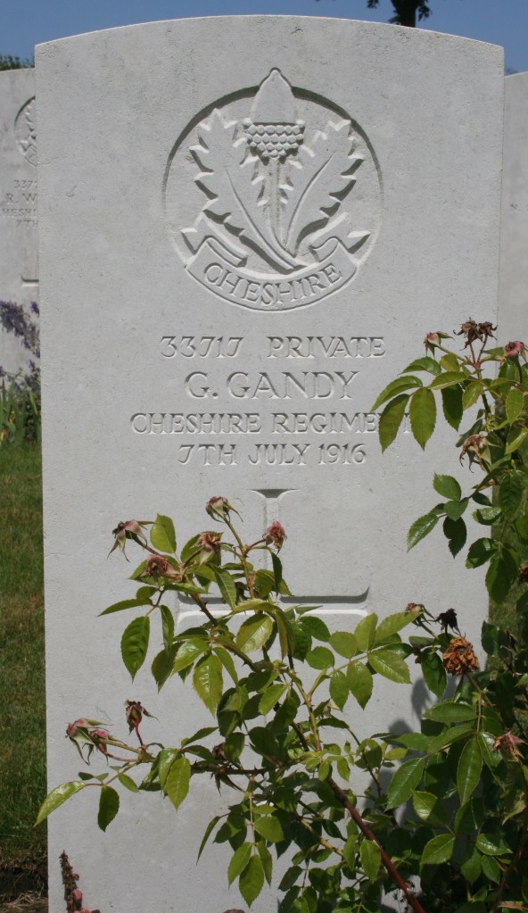 7/07/1916 Private George Gandy 13th Bn. Ovillers Military Cemetery, Somme France. ‘33717’ (pic from findagrave.com – with thanks)