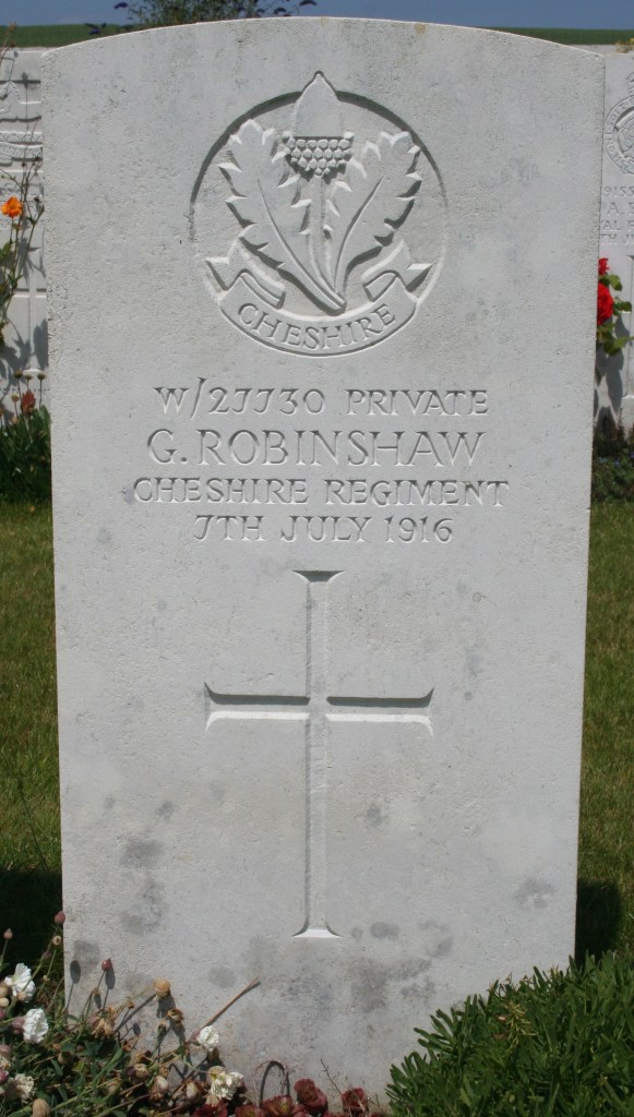 7/07/1916 Private Joseph Gregory (Age 23) 11th Bn. Warloy-Baillon Communal Cemetery Extension, Somme France. ‘16717’ Son of John Gregory and Clara Gregory, of 31, Flower St., Northwich. (pic from findagrave.com – with thanks)