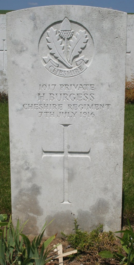 7/07/1916 Private Harold Burgess 13th Bn. Ovillers Military Cemetery, Somme France. ‘1017’ (pic from findagrave.com – with thanks)