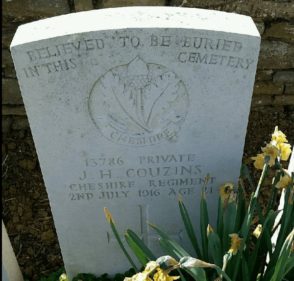 2/07/1916 Private James (H?) Couzins (Age 21) “B” Coy. 9th Bn. Gordon Dump Cemetery, Ovillers-La Boisselle, Somme France. ‘13786’ Son of James and Agnes Couzins, of 7, Faulkner St. South, Harpurhey, Manchester. (pic from findagrave.com – with thanks)