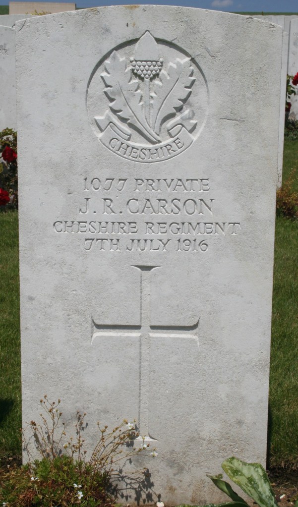 7/07/1916 Private John Robert Carson 13th Bn. Ovillers Military Cemetery, Somme France. ‘1077’ (pic from findagrave.com – with thanks)