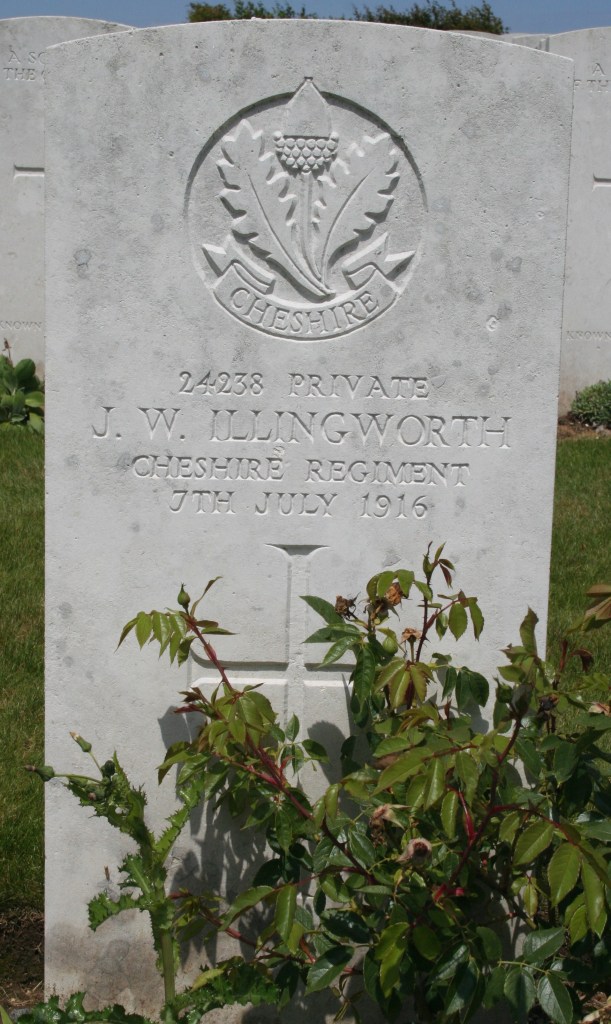 7/07/1916 Private James William Illingworth 13th Bn. Ovillers Military Cemetery, Somme France. ‘24238’ (pic from findagrave.com – with thanks)