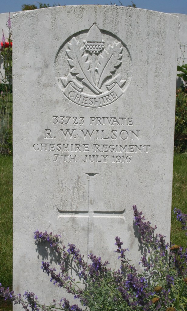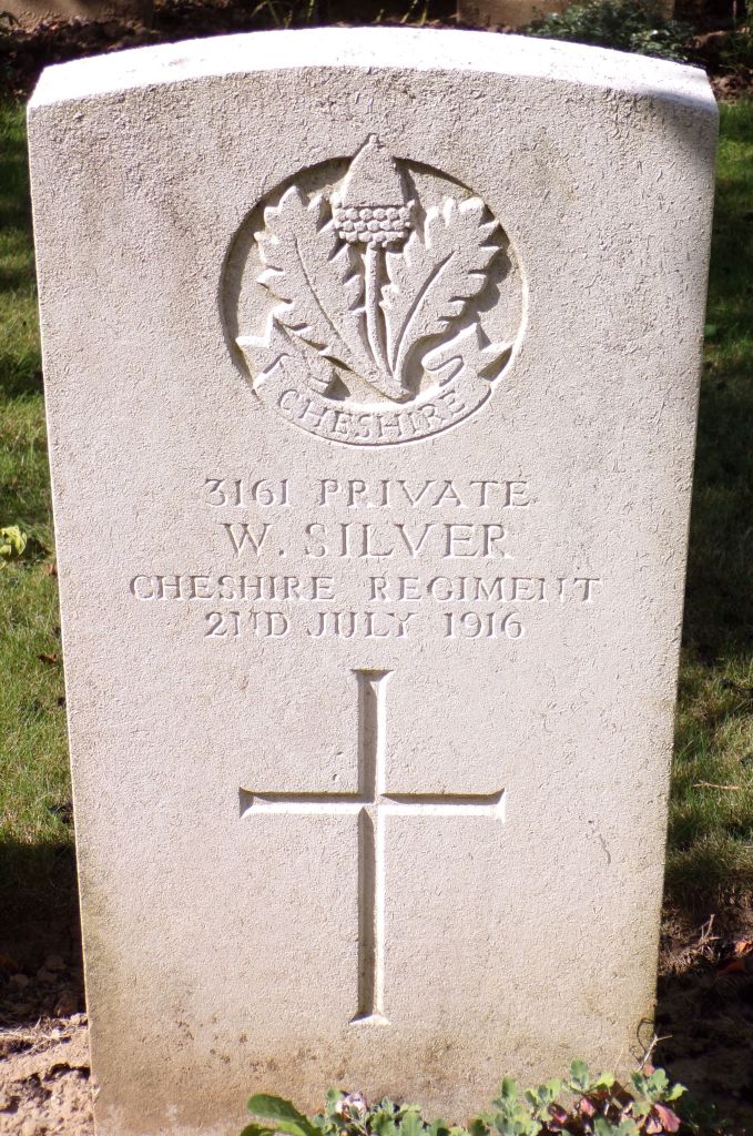 2/07/1916 Private William Silver (Age 20) 1st/5th Bn. Couin British Cemetery, Pas de Calais France. ‘3161’ Son of Thomas and Margaret Silver, of 12, Smith’s Court, Northwich, Cheshire. (pic from findagrave.com – with thanks)