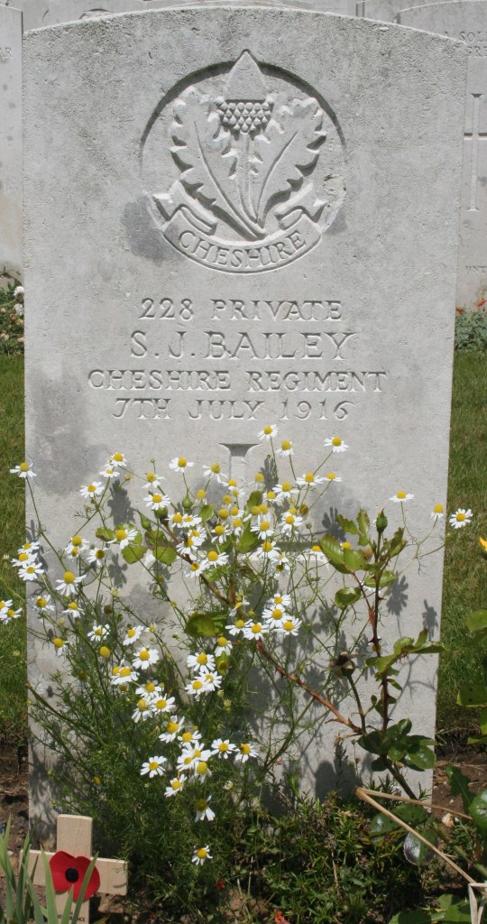7/07/1916 Private Sidney James Bailey 13th Bn. Ovillers Military Cemetery, Somme France. W/228′ (pic from findagrave.com – with thanks)