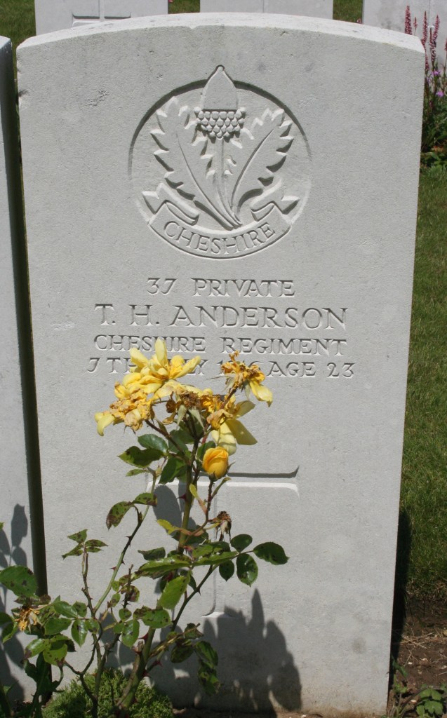 7/07/1916 Private Thomas Harold Anderson (Age 23) 13th Bn. Ovillers Military Cemetery, Somme France. ’37’ Son of Thomas and Eleanor Maria Anderson, of 12, Tabor St., Wallasey, Cheshire. (pic from findagrave.com – with thanks)