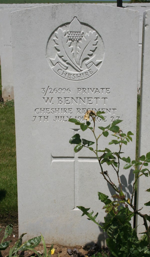 7/07/1916 Private William Bennett (Age 27) 13th Bn. Ovillers Military Cemetery, Somme France. ‘3/26996’ Husband of Elizabeth Bennett, of 122, Oxford Rd., Dukinfield, Cheshire. (pic from findagrave.com – with thanks)