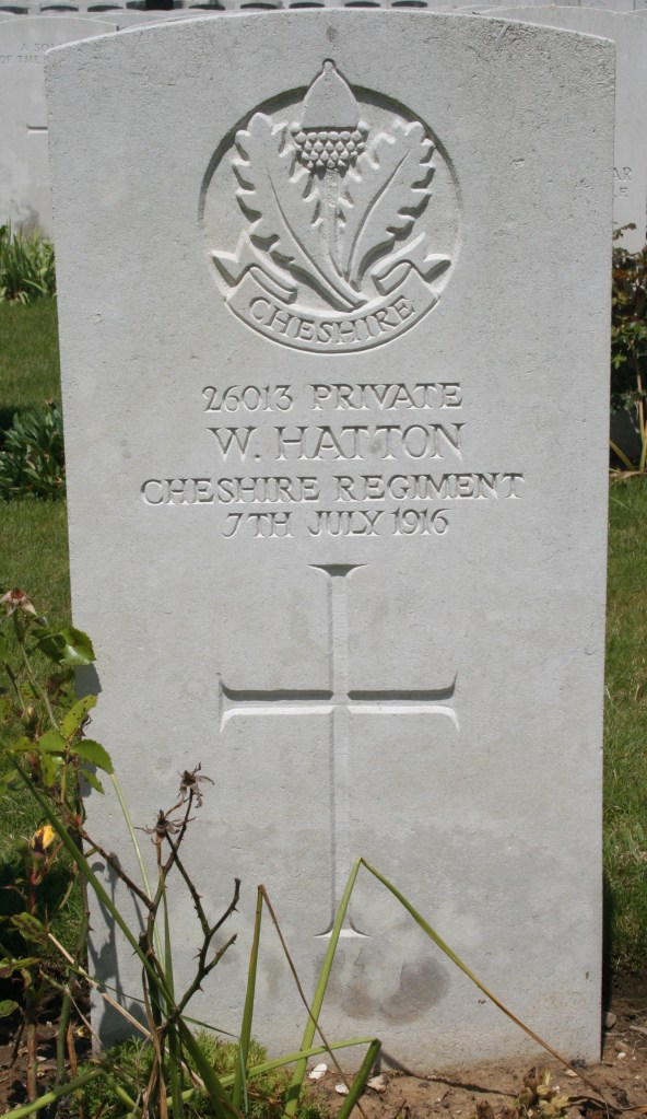 7/07/1916 Private William Hatton 13th Bn. Ovillers Military Cemetery, Somme France. ‘26013’ (pic from findagrave.com – with thanks)