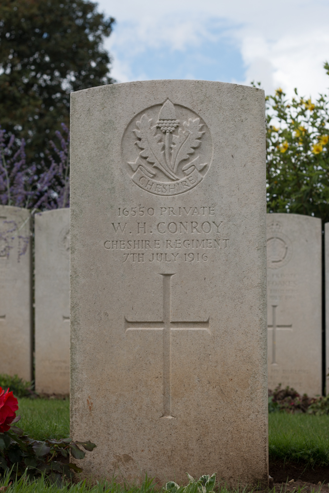 7/07/1916 Private William Henry Conroy 11th Bn. Puchevillers British Cemetery, Somme France. ‘16550’ (pic from findagrave.com – with thanks)