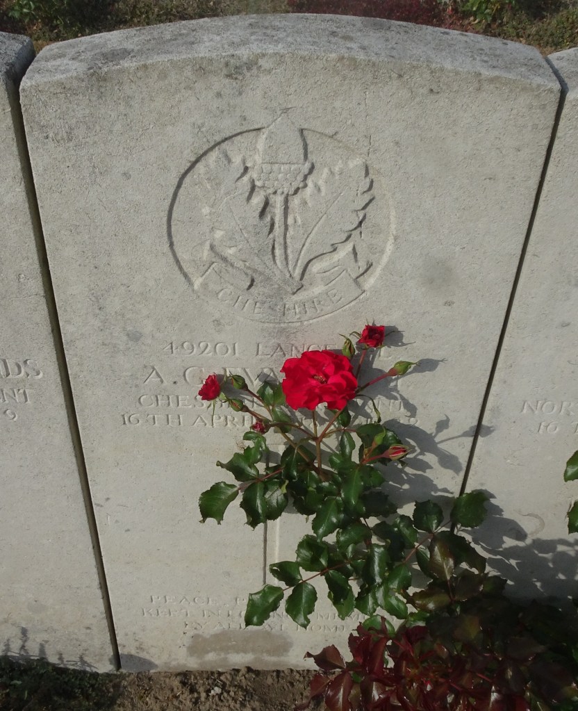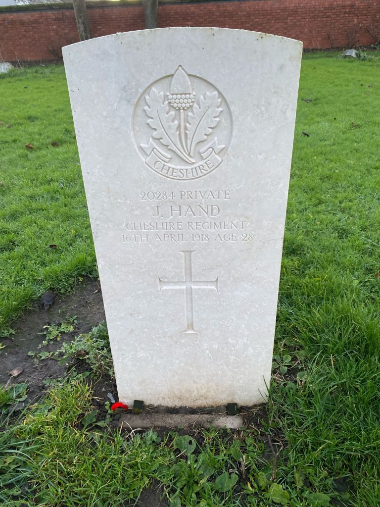 13/04/1918 Corporal James Arthur Oldham (Age 22) 11th Bn. Lijssenthoek Military Cemetery, West-Vlaanderen Belgium. ‘14131’ XXVI. F. 12. Son of Charles and Elizabeth Oldham, of The Village, Prestbury, Macclesfield, Cheshire.